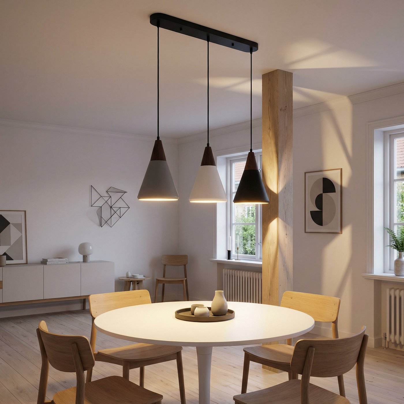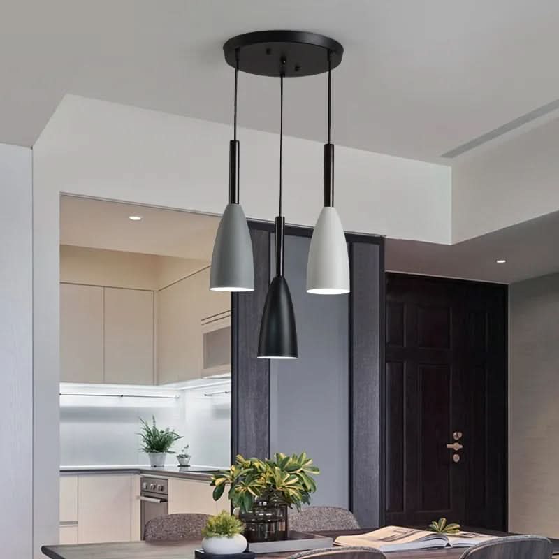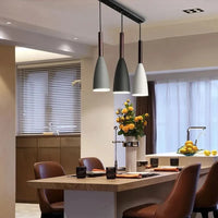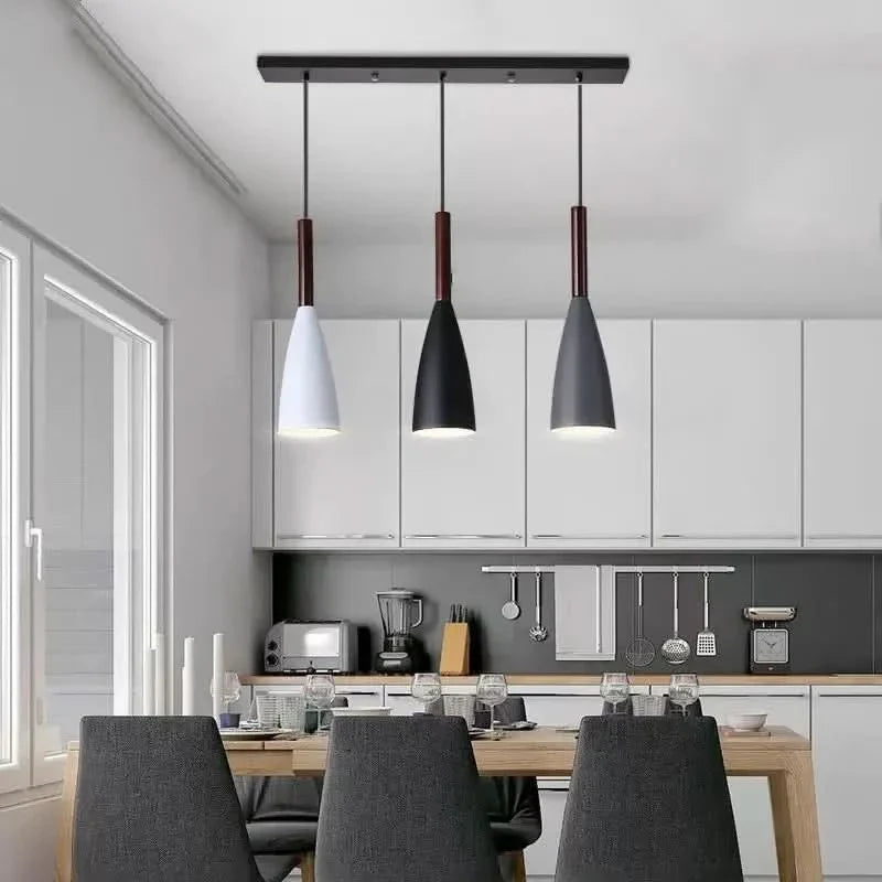 🎨 Scandinavische en Hedendaagse Stijl: De Scandinavische en hedendaagse stijl bestaat uit drie hanglampen met grijze, zwarte, witte of multicolore metalen lampenkappen. De lampen zijn verbonden door een houten steun, die een natuurlijke en warme touch aan het geheel toevoegt.